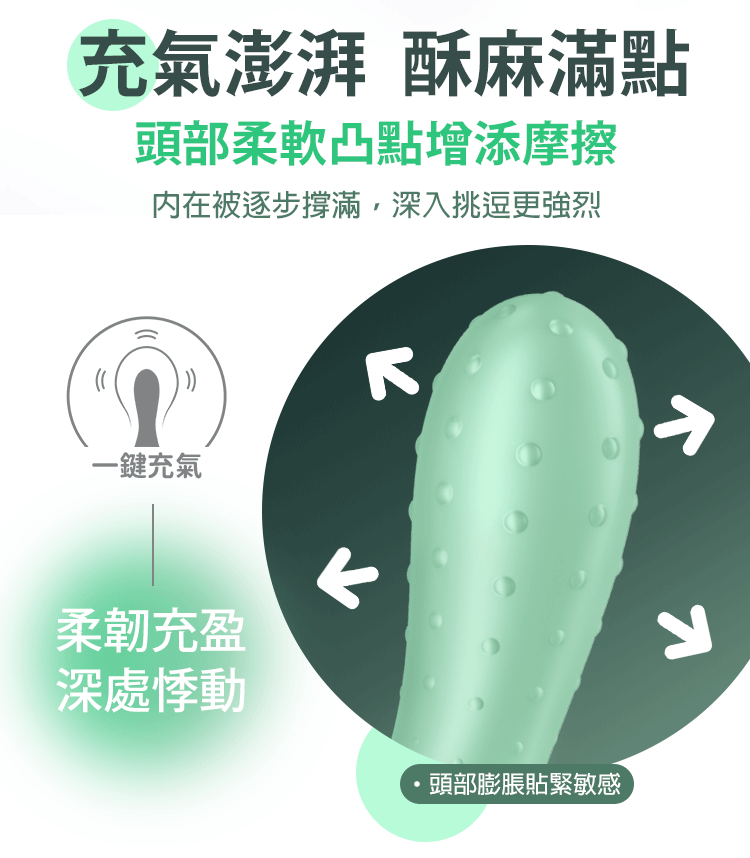 內建充氣技術,頭部膨脹緊貼敏感區域,深層填滿,快感加倍。